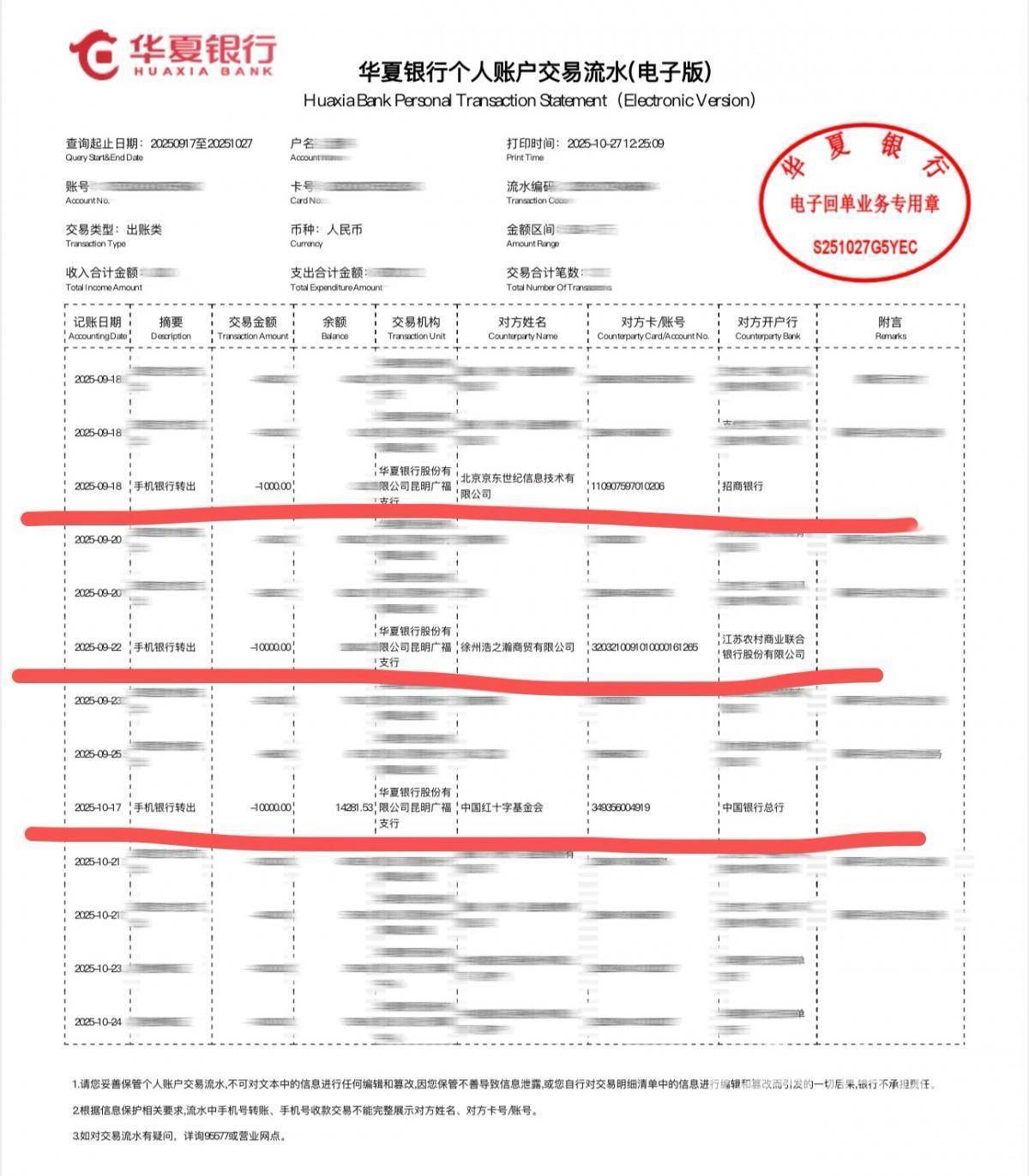 让王先生困惑的还有资金流向,“平台给的收款账户还有中国红十字基金会这种官方账户名,看着特别正规,但是每次要求打款的账户都不一样,比如一开始投资的1000元是转入北京京东世纪信息技术有限公司的账户,第二次投资的1万元是转入一家名叫“徐州浩之瀚商贸有限公司”的账户里,第三次追加投资的1万元则被要求转入到中国红十字基金会的账户里。”